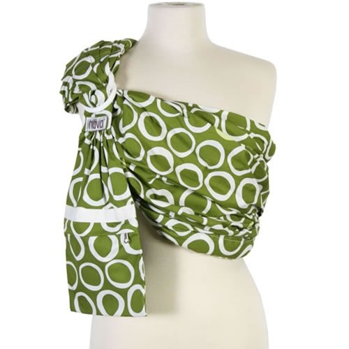 Green is known to bring calmness.. what more could a parent desire when wearing baby? The Jaden baby sling is the perfect print for mom or dad, with simple circles against a fresh green. The Hava baby sling is a fashionable, lightweight, compact and breathable ring sling. It features a 7 x 7 inch zippered pocket in the tail, a small, contoured shoulder pad for your comfort as baby gains weight, pleated fabric around the rings for fantastic weight distribution and sleek padding through the top and bottom rails to keep red marks off of your baby. Includes an instructional DVD. Proudly made in the USA. Please determine your proper size by referring to the size chart shown as part of the alternate product images above. Start by finding the row that best describes your pre-pregnancy body. Focus primarily on your shirt size. The most accurate way to determine your size is to use a piece of string to measure from the cap of your right shoulder across your body to your left side at the waistline. If it is between 19 and 23 inches we would recommend the Petite size, if between 23 and 26 inches the Regular size, and if between 26 and 28 inches the Long size.
