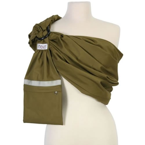 Olive, a Classic HAVA baby sling goes with everything. The Hava baby sling is a fashionable, lightweight, compact and breathable ring sling. It features a 7 x 7 inch zippered pocket in the tail, a small, contoured shoulder pad for your comfort as baby gains weight, pleated fabric around the rings for fantastic weight distribution and sleek padding through the top and bottom rails to keep red marks off of your baby. Includes an instructional DVD. Proudly made in the USA. Please determine your proper size by referring to the size chart shown as part of the alternate product images above. Start by finding the row that best describes your pre-pregnancy body. Focus primarily on your shirt size. The most accurate way to determine your size is to use a piece of string to measure from the cap of your right shoulder across your body to your left side at the waistline. If it is between 19 and 23 inches we would recommend the Petite size, if between 23 and 26 inches the Regular size, and if between 26 and 28 inches the Long size.