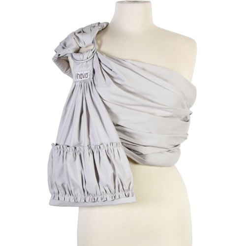 Ash, a light grey color, is part of the HAVA Snap family. The Snap! collection features aluminum rings and a flowing tail that includes a hidden 10 by 12 inch zippered pocket. The matching ruffled Accent snaps on and can be replaced by classy, colorful, or whimsical prints. There are even some Accents that will bring some bling to your sling. Additional Accents sold separately. Be creative. Have fun! Please determine your proper size by referring to the size chart shown as part of the alternate product images above. Start by finding the row that best describes your pre-pregnancy body. Focus primarily on your shirt size. The most accurate way to determine your size is to use a piece of string to measure from the cap of your right shoulder across your body to your left side at the waistline. If it is between 19 and 23 inches we would recommend the Petite size, if between 23 and 26 inches the Regular size, and if between 26 and 28 inches the Long size.